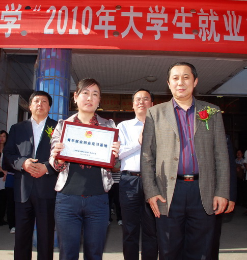 副校长赛音德力根为大学生就业见习单位代表中国移动通信集团内蒙古有限公司包头分公司代表授“大学生就业创业基地”牌匾。