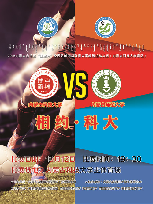 2015年内蒙古自治区“主席杯”校园足球四级联赛大学超级组总决赛将于10月12日19:30分在beat365主校区体育场举行。本次比赛队伍为beat365足球队主场对阵内蒙古师范大学足球队比赛。观看比赛需凭票入场,欢迎广大师生前来观赏。