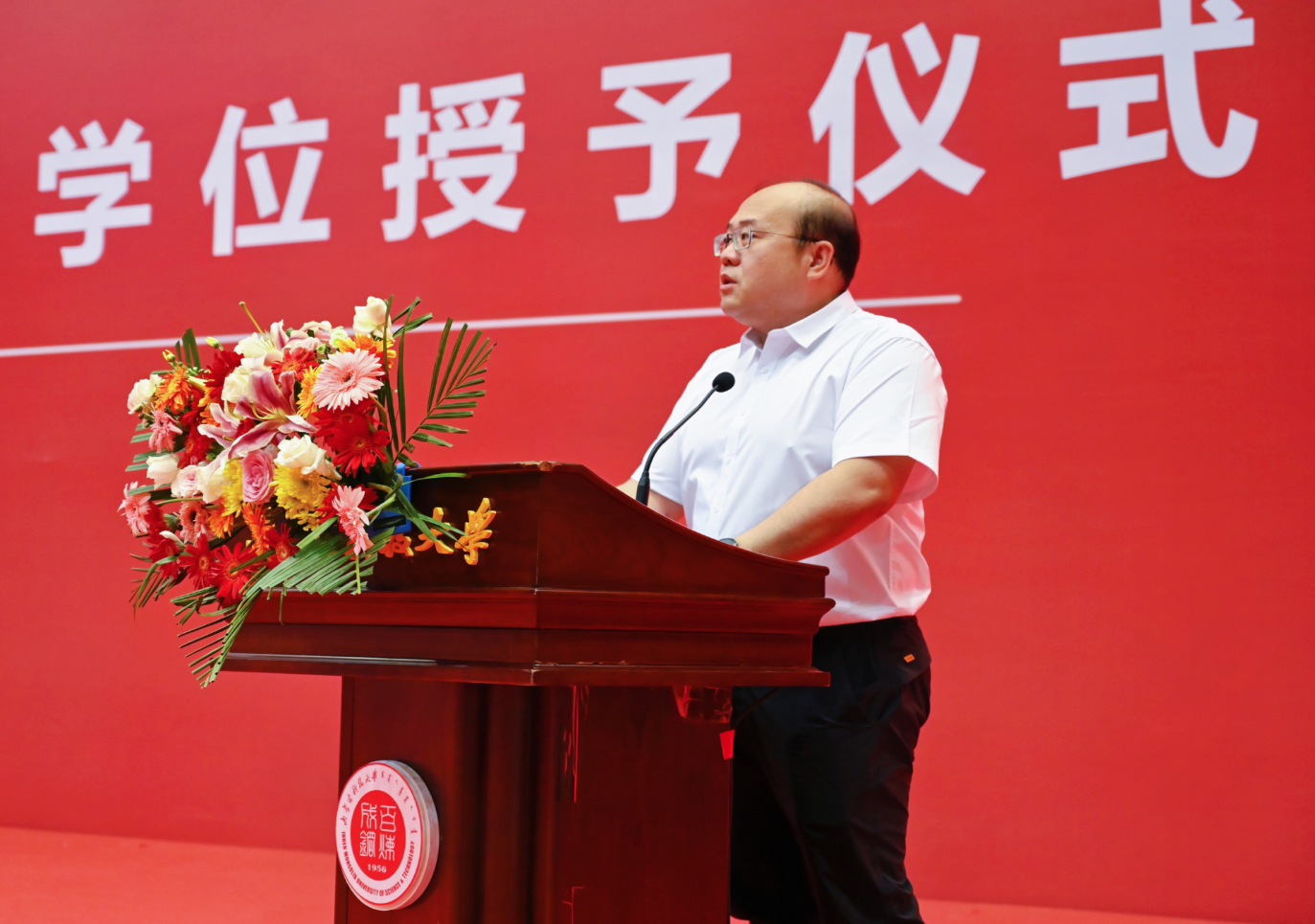 校友代表武轶彬致辞。他说,二冶集团与科大保持着长期良好的合作关系,双方在人才培养、产学研合作等方面联系对接紧密。希望毕业生踔厉奋进再出发,勇毅前行向未来,希望校友能与母校一起凝心聚力,讲好校友故事,发挥校友智慧,汇集校友力量,为建设国内一流大学作出应有贡献。
