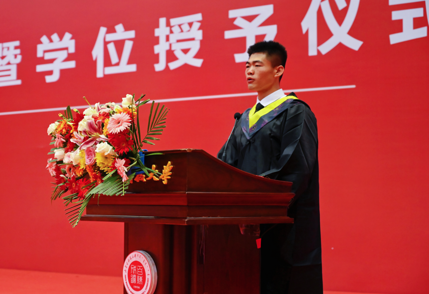 本专科毕业生代表王凯涛分享了在科大感悟最深的三个词,“感恩”“青春”“责任”。他说,我们应不负师长期望,用奋斗拼搏诠释无悔的青春,用责任担当激昂生命的力量。