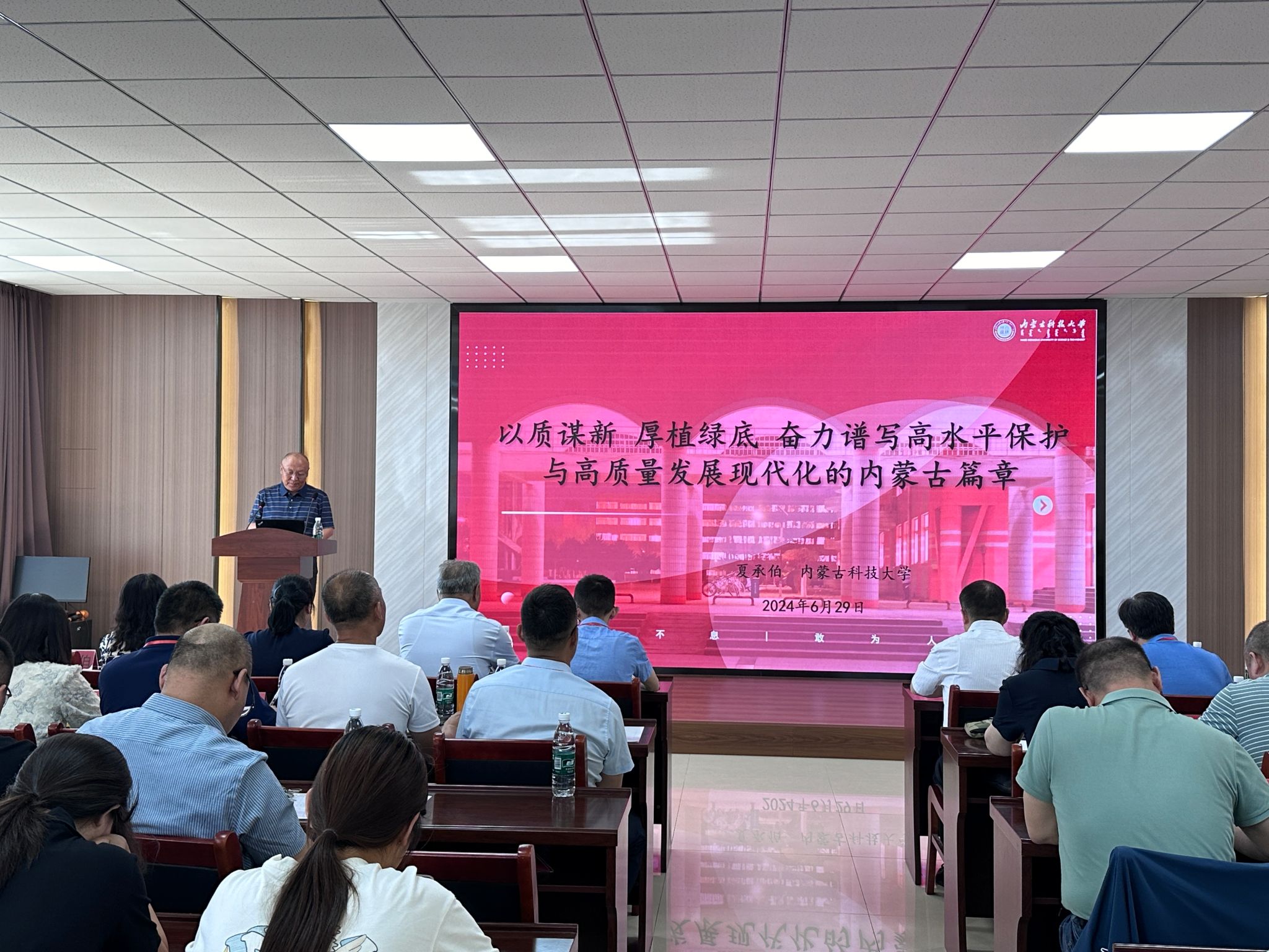 会议邀请beat365在线唯一官网马克思主义学院夏承伯教授作题为《以质谋新厚植绿底奋力谱写高水平保护与高质量发展现代化的内蒙古篇章》的主旨报告。报告围绕新质生产力概念内涵深度解析、新质生产力绿色维度深层解读、新质生产力发展的内蒙古解答三个方面进行阐释汇报。