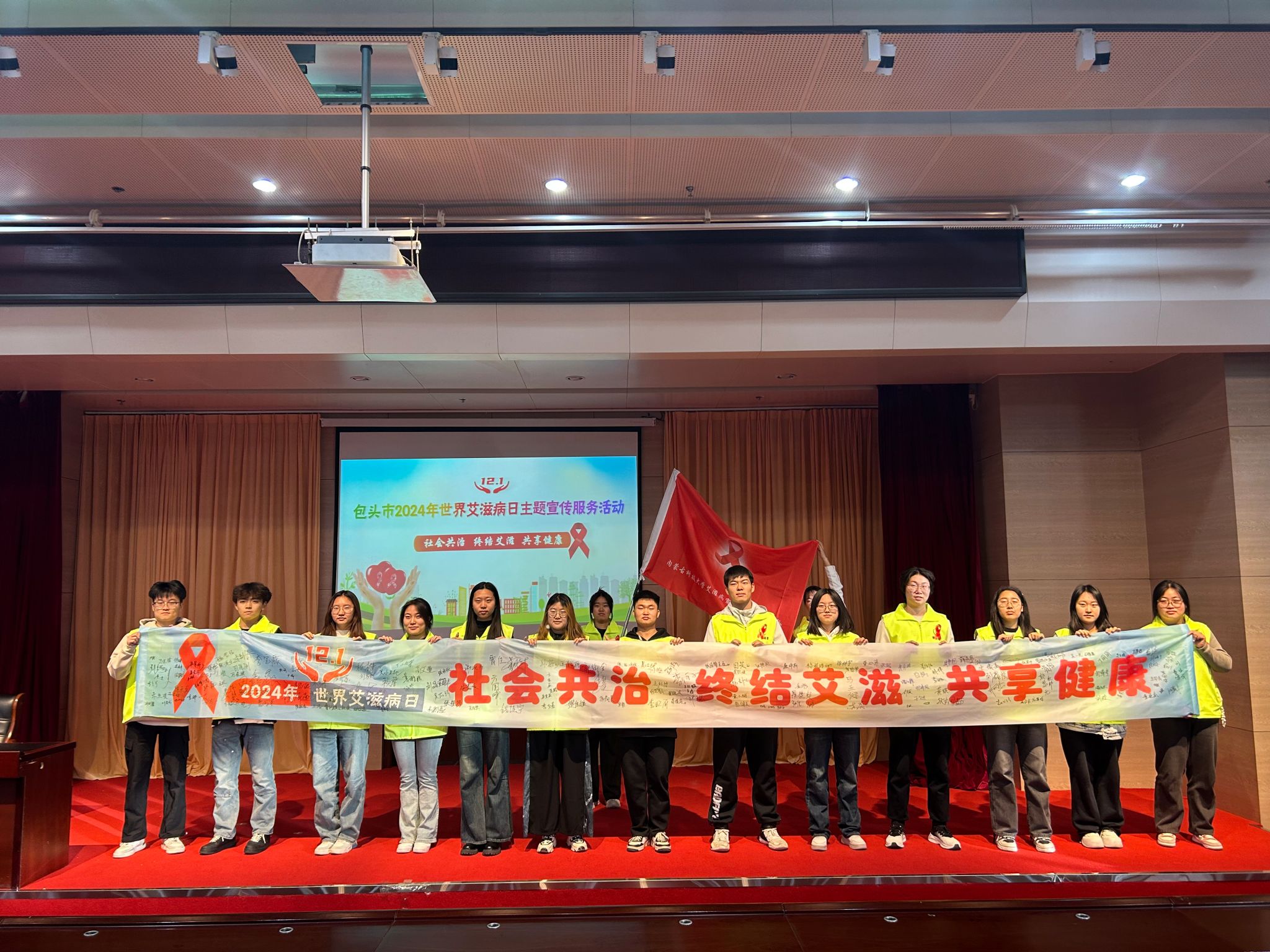 活动现场,包头市计划生育协会秘书长李昊代表包头市卫生健康委员会向beat365授旗,随后志愿者代表宣读《世界艾滋病日活动倡议书》,号召同学们积极行动共同抗击艾滋病,铿锵有力的集体宣誓彰显着志愿者们为防艾事业贡献力量的决心和信心。