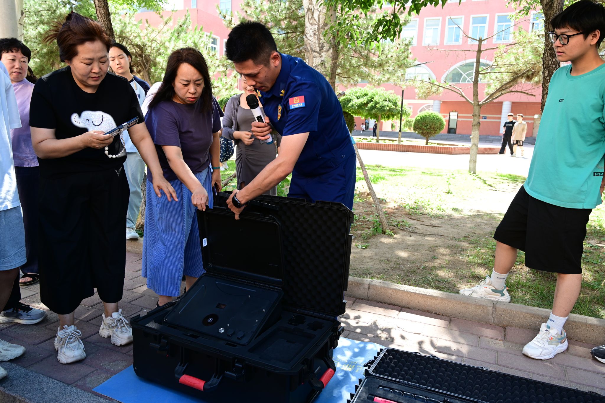 第二环节为灭火器讲解与实操。消防员讲解了灭火器种类、适用范围及使用方法。在耐心且专业的指导下,现场师生实操体验扑灭初期火灾。