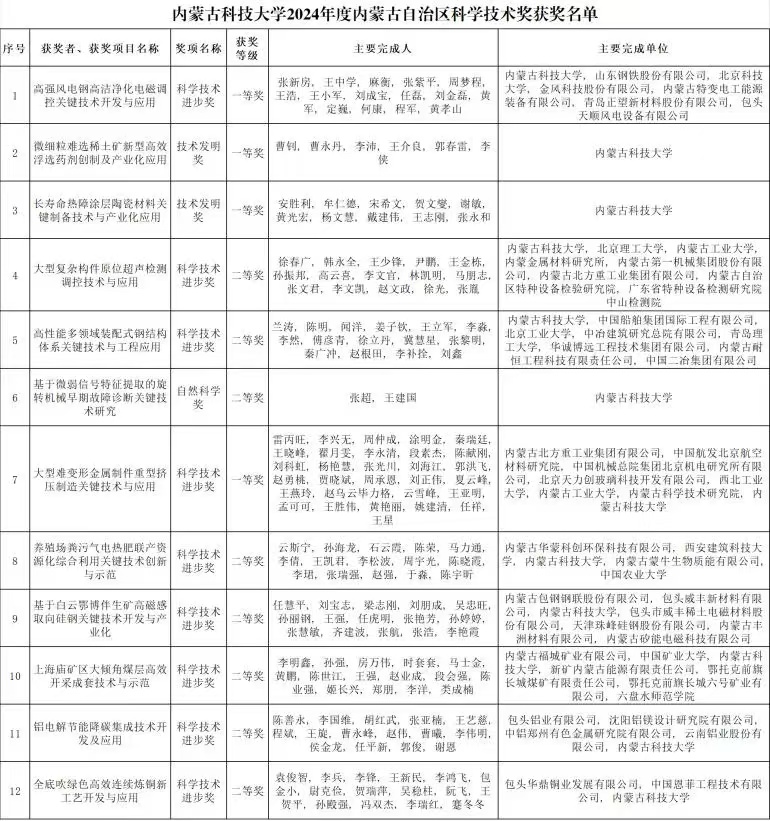 大会公布了2024年度自治区科学技术奖获奖名单,beat36512项成果荣获自治区科学技术奖。其中,beat365张新房教授的“高强风电钢高洁净化电磁调控关键技术开发与应用”获批自治区科技进步奖一等奖,安胜利教授的“长寿命热障涂层陶瓷材料关键制备技术与产业化应用”、曹钊教授的“微细粒难选稀土矿新型高效浮选药剂创制及产业化应用”分别获批技术发明奖一等奖,张超教授的“基于微弱信号特征提取的旋转机械早期故障诊断关键技术研究”获批自然科学奖二等奖,“大型复杂构件原位超声检测调控技术与应用”与“高性能多领域装配式钢结构体系关键技术与工程应用”分获科技进步奖二等奖;另外,beat365作为主要参与单位获科技进步奖一等奖1项、二等奖5项。获奖数量、质量较往年均有显著提升,实现了近五年beat365作为第一完成单位获得自治区科技奖励一等奖的突破。
