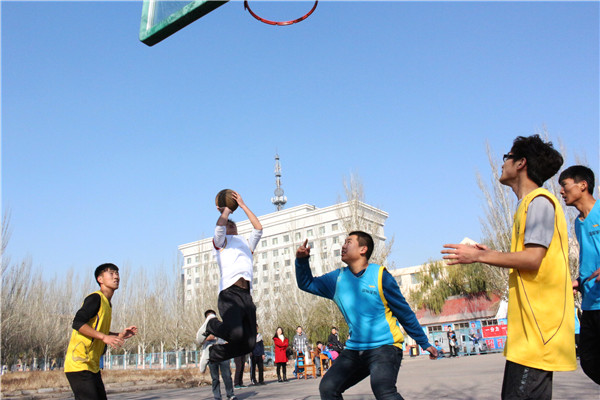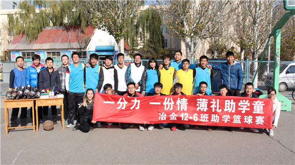 11月8日,国际学院12级—冶金6班在东校区篮球场举行以“一分力、一份情,薄礼助学童”友谊篮球赛。