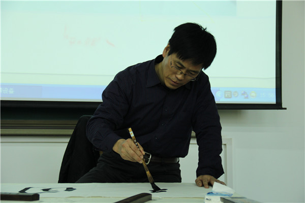 乔雁老师以《对于书法的再认识》为题,分别从书法的含义、书写方法、艺术的文字、黑白世界的阴阳哲学、书法的欣赏标准、古代书法名家作品及经典作品赏析等方面做了详细的讲述。他通过理论讲解、现场即兴书写及师生互动让beat365师生领略到书法的真正内涵和魅力。最后,校团委负责人代表学校特聘请乔雁老师为beat365客座教授并为其颁发了聘书。