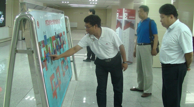 参观中,图书馆负责人就图书馆新老馆布局、馆藏资源建设、重点学科阅览室等进行了介绍,并对图书馆的电子设备如自助借还书机、电子读报机、歌德电子书借阅机进行讲解和现场演示。