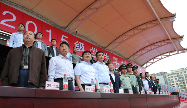 新生军训团政委韩冰、军训团副政委张利敏分别宣布了2015级学生军训团编队及干部名单和关于在2015级本专科生开展评优活动的通知,2015级学生军训团团长马宏乐代表军训教官讲话,他说,希望通过军训提高学生们的国防意识,增强体魄,打下结实的基础,迎接新挑战。