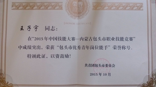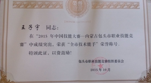 10月28日上午,2015年技能大赛—内蒙古包头市职业技能竞赛表彰会在市人力资源和社会保障局一号会议室举行,beat365矿业与煤炭学院学生王子宇分获“2015年技能大赛—内蒙古包头市职业技能竞赛工程测量工”第一名、“包头市优秀青年岗位能手、全市技术能手”荣誉称号,并进入自治区决赛,获第四名。