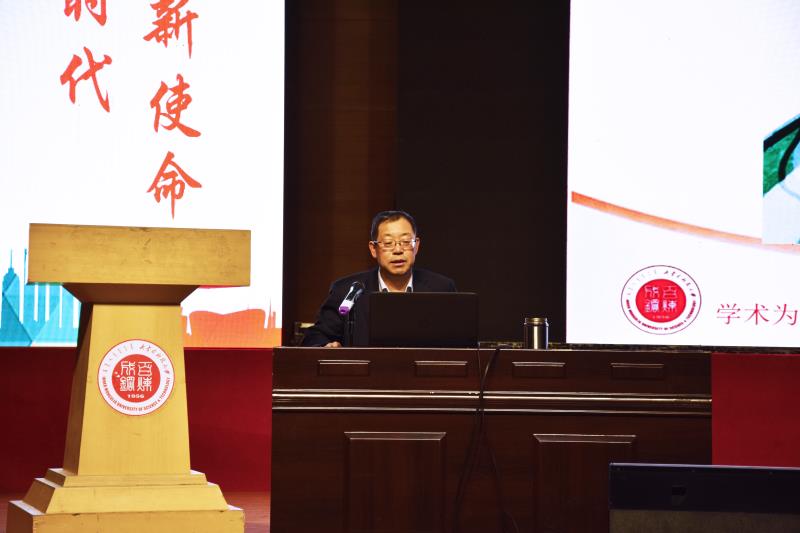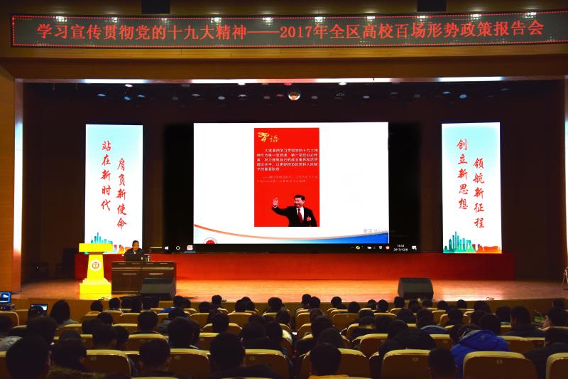 为进一步学习宣传贯彻党的十九大精神,引导广大青年学生自觉用习近平新时代中国特色社会主义思想武装头脑、指导行动,12月8日下午,“学习宣传贯彻党的十九大精神 2017全区高校百场形势政策报告会”在beat365举办。beat365文法学院院长、教授委员会主任朱海珅教授作了以《站在新时代、肩负新使命、创立新思想、领航新征程——十九大报告关键词“新”之解读》为主题的报告,为beat365在场的500余名师生深层次、多角度、全方位解读了党的十九大报告。报告会由校团委书记韩冰主持。