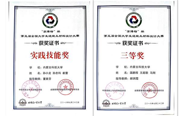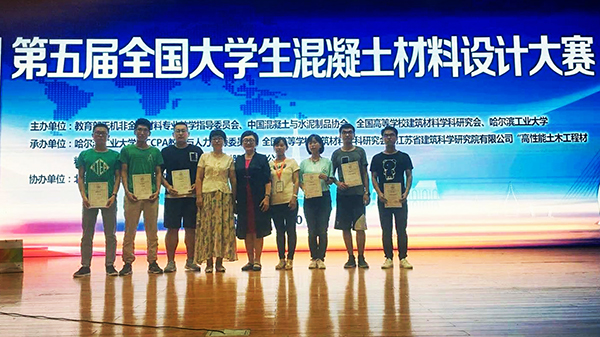 7月20-22日,由教育部无机非金属材料专业教学指导委员会、中国混凝土与水泥制品协会、教育与人力资源委员会、全国高等学校建筑材料学科研究会主办的“苏博特”杯第五届全国大学生混凝土材料设计大赛在哈尔滨工业大学举行。beat365在线唯一官网土木工程学院杭美艳教授、郝润霞副教授、董素芬老师带领的2支参赛队伍成绩优异。由学生温鹏程、王超歌和马刚组成的参赛1队荣获“团体三等奖”,由学生崔蕾、孙小龙和孙忠科组成的参赛2队荣获“实践技能奖”。