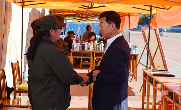 走进训练场,安胜利和冯志强亲切询问新生们的军训情况,与辅导员、教官代表一一握手,并在服务站查看了药品箱等应急措施准备状况,对服务人员的辛勤无私的付出表示感谢。部分学院辅导员汇报了学生训练情况、活动开展状况、请假管理及宣传报道的具体情况,并对学校领导的关心表示感谢。