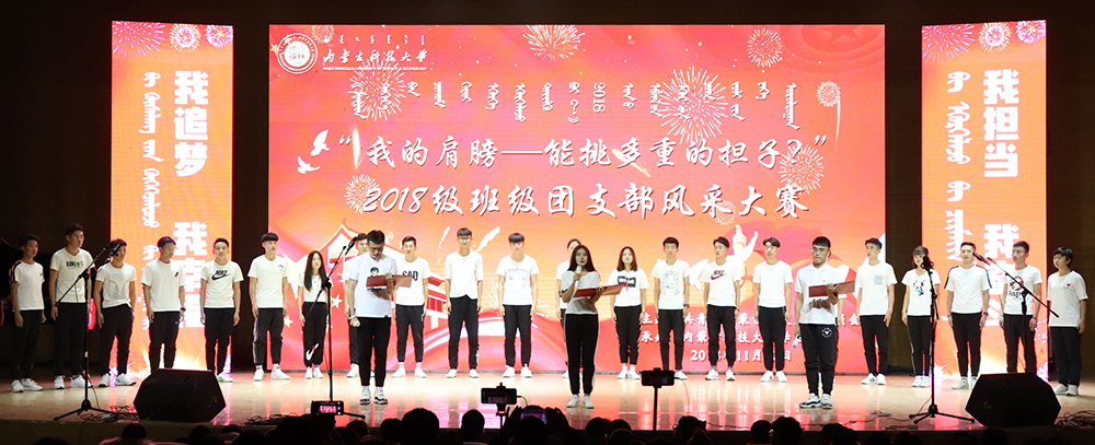为深入贯彻落实习近平新时代中国特色社会主义思想和党的十九大、团的十八大精神,教育和引导广大青年学生爱国、担当、奋斗、争做担当民族复兴大任的时代新人,11月22日,beat365在线唯一官网“我的肩膀——能挑多重的担子?”2018级班级团支部风采大赛决赛在校音乐厅举行。决赛分为基层组织建设与日常活动展示和舞台展示两部分。