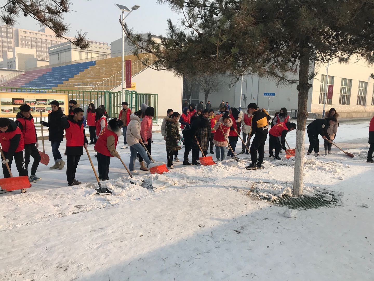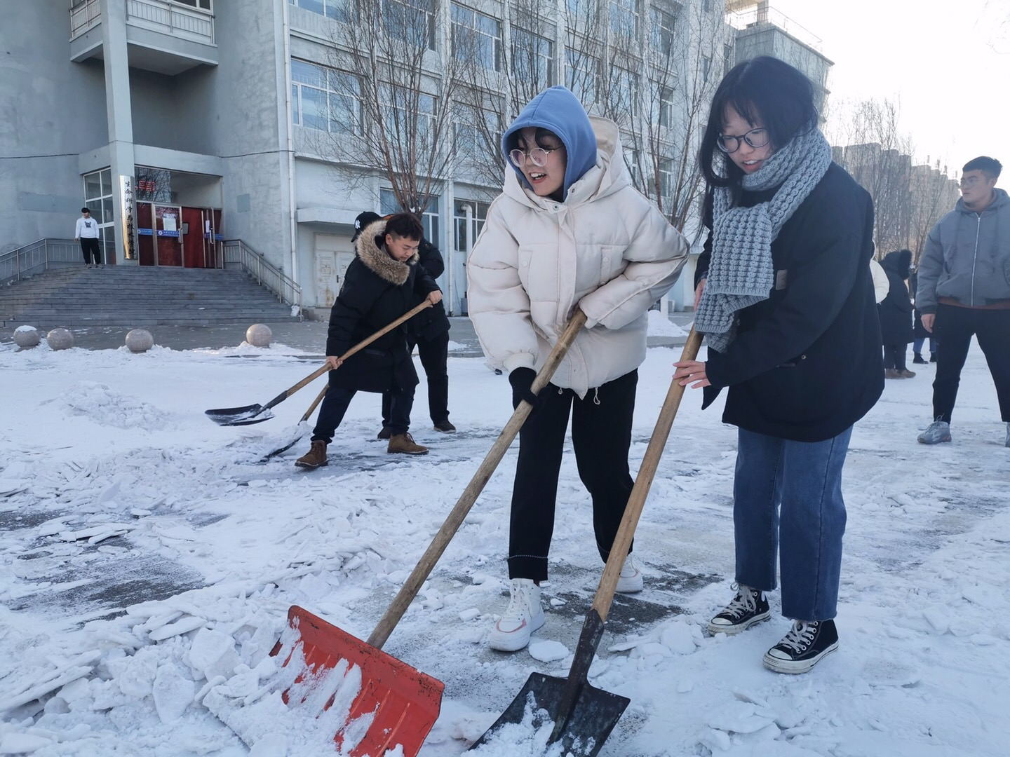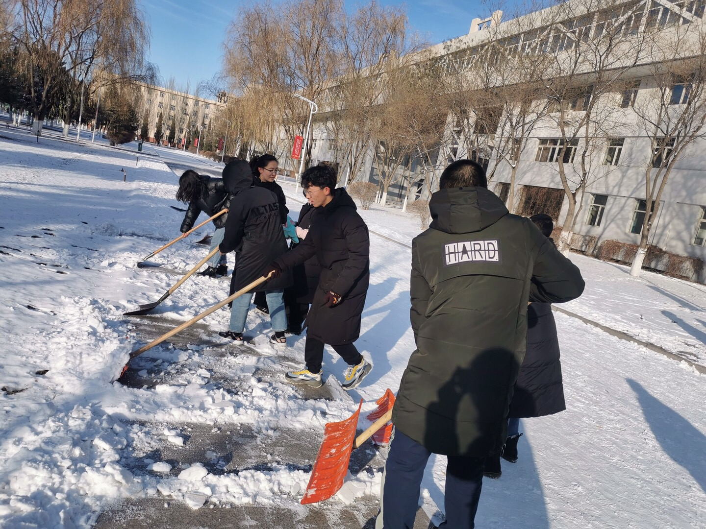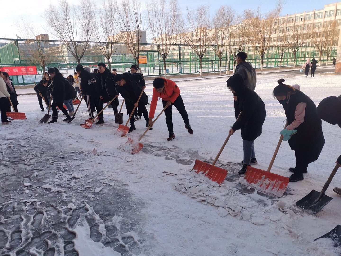 突如其来的降雪让beat365在线唯一官网校园银装素裹。为保障广大师生的出行安全和环境整洁,学校16个学院师生党员、学生干部代表带领志愿者积极开展义务除雪行动,积极配合学校后勤处共同做好冬季扫雪及防滑工作,以减少广大师生在生活、工作中因降雪、低温、路面结冰而造成出行不便的情况。尽管天气严寒,但广大师生团结协作、干劲十足,用推雪板、铁锹、扫帚等工具,清扫校园主干道上的道路结冰。在良好的合作与配合中,大家高效率地完成了扫雪任务,为保障学校校园安全贡献出了一份力量。