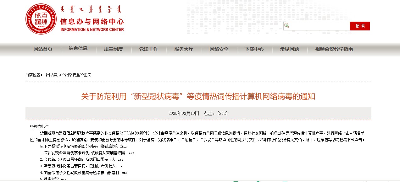 六是强化安全,做好疫情防控期间网络安全及运行保障。疫情期间,信息办与网络中心强化网络安全防护工作,及时传达网络安全预警,开通前台网络技术安全服务热线,扎实做好网络技术安全防护工作。针对网上教学平台服务器所开通的外网服务器,上线前进行安全监测,保证系统和应用的安全性。监测WAF设备监控,系统监控、会话监控和处理能力,安排厂家做好应急故障处理准备。制定重要信息系统保障措施,每天安排远程巡检监控,加强设备运维管理和应急故障处理准备,确保疫情防控期间的网络教学基本保障服务。及时发布网络安全警示,发布了《关于防范利用“新型冠状病毒”等疫情热词传播计算机网络病毒的通知》和《关于“Apache Tomcat存在文件包含漏洞”网络安全预警通报》等网络安全预警,并通过微信公众号、OA等渠道通知学校各单位做好安全防范和漏洞修复工作,保障校园网安全运行。