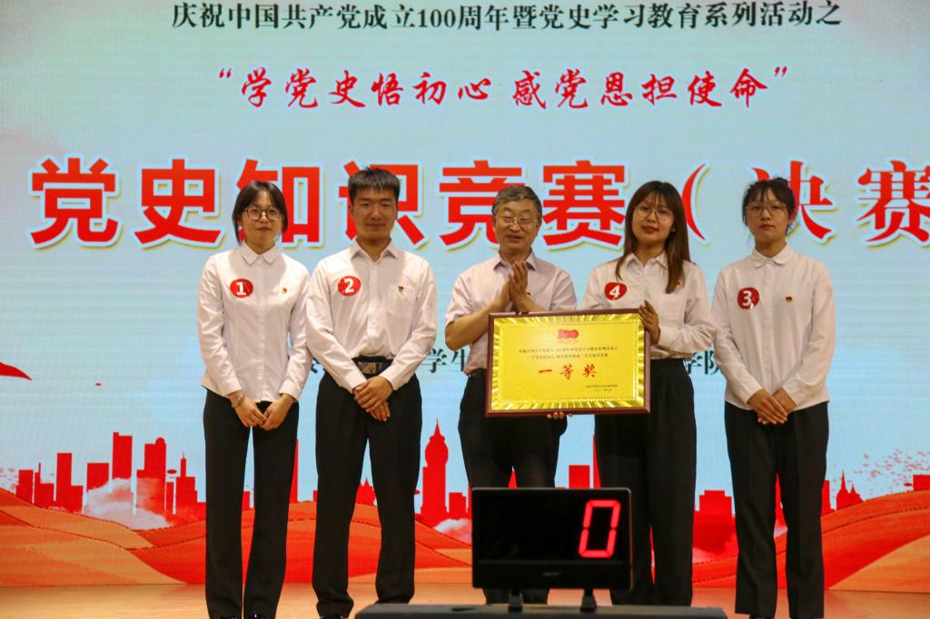 为庆祝中国共产党成立100周年,扎实推动党史学习教育走深走实,引导全校师生学史明理、学史增信、学史崇德、学史力行,坚定听党话、跟党走的思想自觉和行动自觉,6月10日晚7点,beat365在线唯一官网“永远跟党走”庆祝中国共产党成立 100 周年群众性主题教育和文化系列活动之“学党史悟初心 感党恩担使命”党史知识竞赛(决赛)在学校音乐厅举行。校党政领导安胜利、冯志强、赵增武、檀宝文,党委委员、组织部部长田立志出席竞赛现场,基层党委、党总支负责人代表,400余名师生代表到场观看决赛。本次比赛特邀学校马克思主义学院教授杨彦斌担任点评嘉宾。