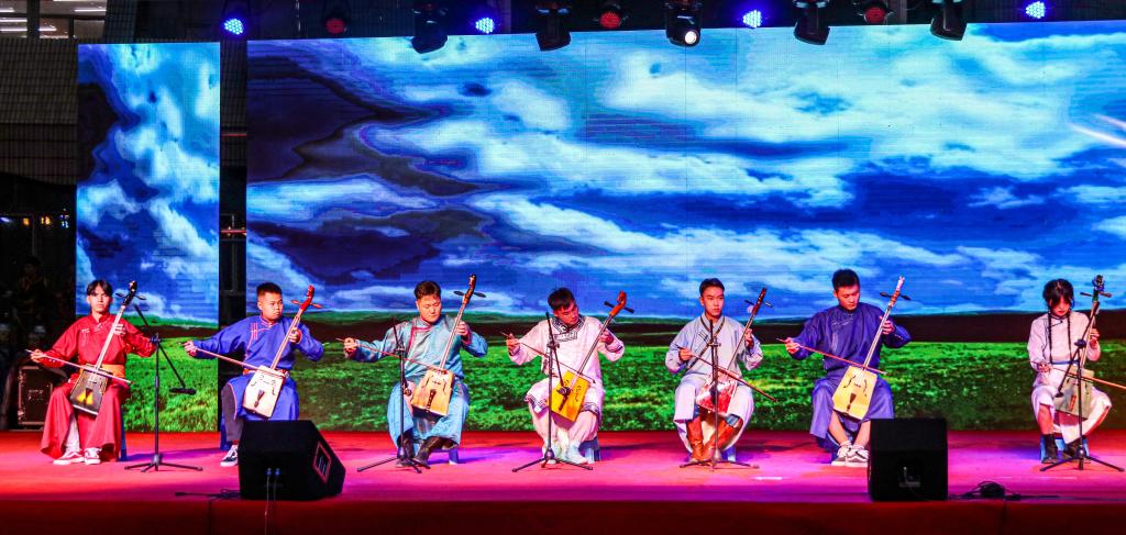 晚会由艺术与设计学院老师带来的歌曲《共筑中国梦》拉开帷幕;苏尔沁舞蹈艺术协会来的蒙古舞和神骏乐团的马头琴表演展现了一往无前的“蒙古马精神”;艺术与设计学院教师王蕾和19级音乐系学生的歌曲《灯火里的中国》,歌唱祖国的繁荣富强,歌唱小康社会里的幸福生活;百灵鸟合唱团的《欢乐的那达慕》,抒发对美丽草原的热爱之情。晚会在教职工舞蹈队和毕业生车树雨《生命里的歌》的舞蹈表演中到达高潮,跳跃的音符演奏着生命的活力,绚烂的舞姿混合着时代的气息,现场观众陶醉其中。