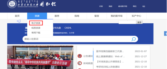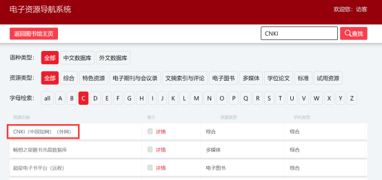 2)登录后选择“图书馆电子资源导航系统”,即可在线访问图书馆的数据库资源,使用方法参照校内访问示例。