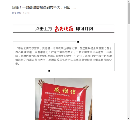 “感谢之情无以言表,只能借一寸方纸表达感谢之意,在这里我们全家发至(自)内心真诚地道一声谢谢你们!在这个寒冷的冬天,三名大学生给社会送来一丝温暖,感谢beat365在线唯一官网培养出这么优秀的学生!”近日,市民白女士将一封感谢信送到了beat365在线唯一官网,感谢该校三名大学生在寒冬里帮助她摔倒在路旁的父亲。