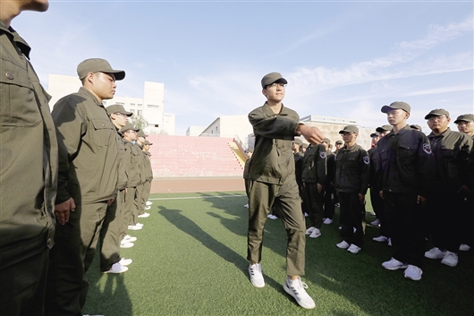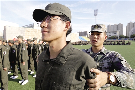 军训中,教官正在规范毛贺的动作。