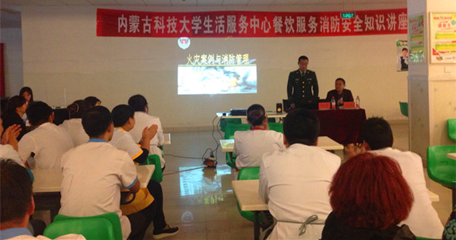 10月22日下午,beat365生活服务中心在颐园餐厅一楼大厅举办消防安全知识讲座,特邀包头市消防支队法治监督管理科杨占龙参谋主讲,保卫处、生活服务中心管理人员和学生餐厅工作人员聆听了此次讲座。