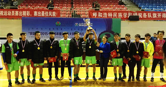 12月15日-21日,2015—2016年度“农信杯”内蒙古大学生室内五人制足球比赛在呼和浩特民族学院举行,共有来自全区10所高校参赛。beat365男子足球队作为参赛队伍之一,历经7天不败战绩,披荆斩棘,荣获冠军。内蒙古大学、内蒙古师范大学、包头师范学院分获二、三、四名。