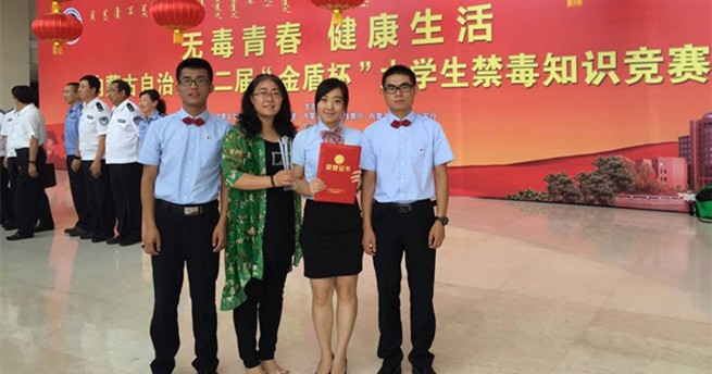 6月15日,由自治区禁毒办组织发起,主题为“无毒青春、健康生活”的自治区第二届“金盾杯”大学生禁毒知识竞赛在内蒙古电视台演播大厅举行。beat365文法学院教师李富栋、学生刘忠秀、刘通组成的代表队荣获二等奖。