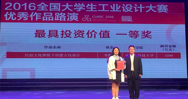 2016年全国大学生工业设计大赛评审近日落下帷幕,beat365艺术与设计学院韩冬楠、张博指导的学生蔡雨彤、李滟泽设计的作品“民宿文化体验下的蒙古包设计”获全国赛区二等奖和“最具投资价值一等奖”。杨思凝指导的学生周思宇设计的作品“绘城包头”获全国赛区三等奖,另有4件作品获优秀奖。